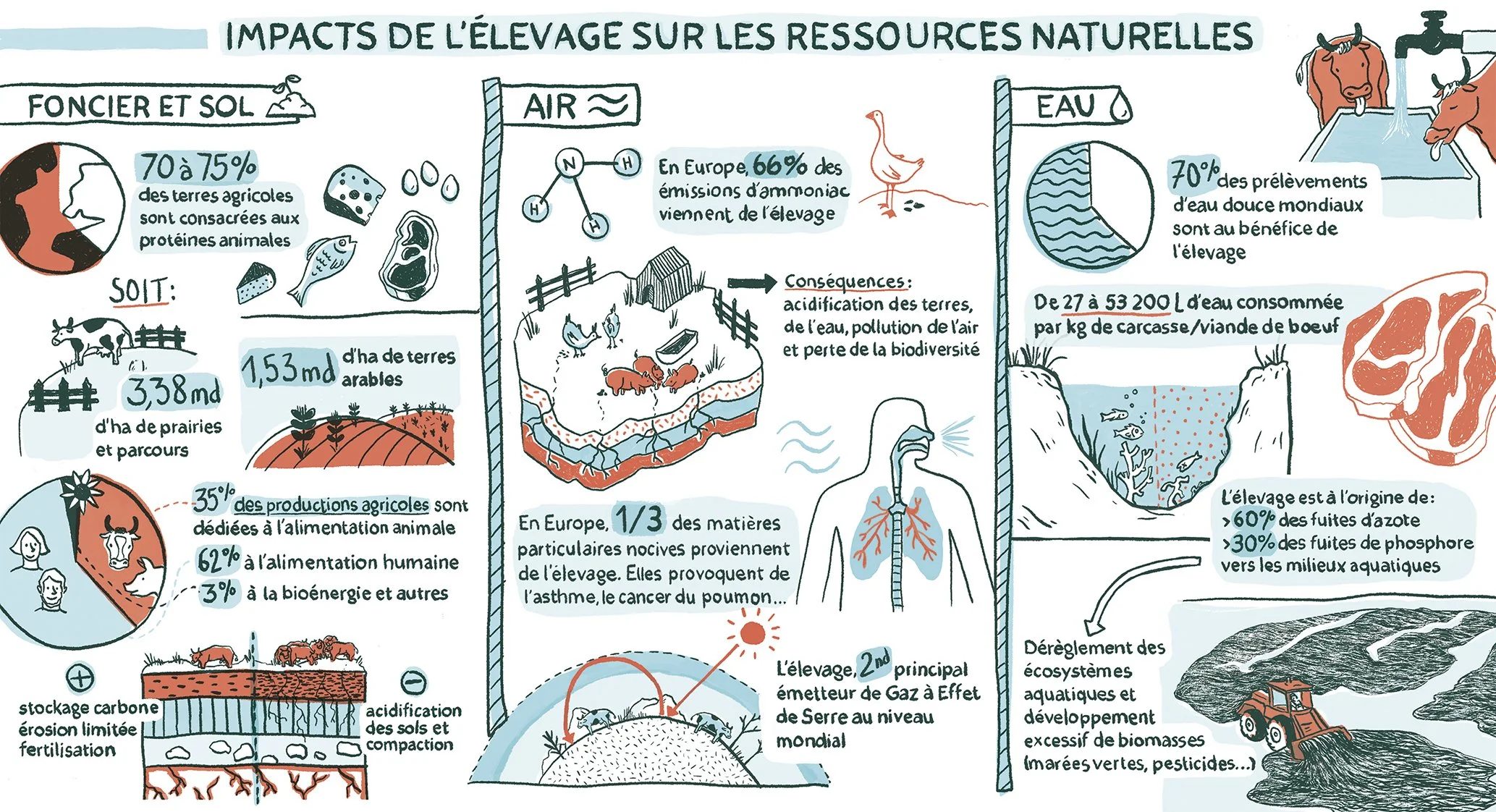 Created from a report by INRA for Terre de Liens, this sketchnote visualises how livestock production affects natural resources. The aim was to take complex scientific data and make it accessible to a wide audience.