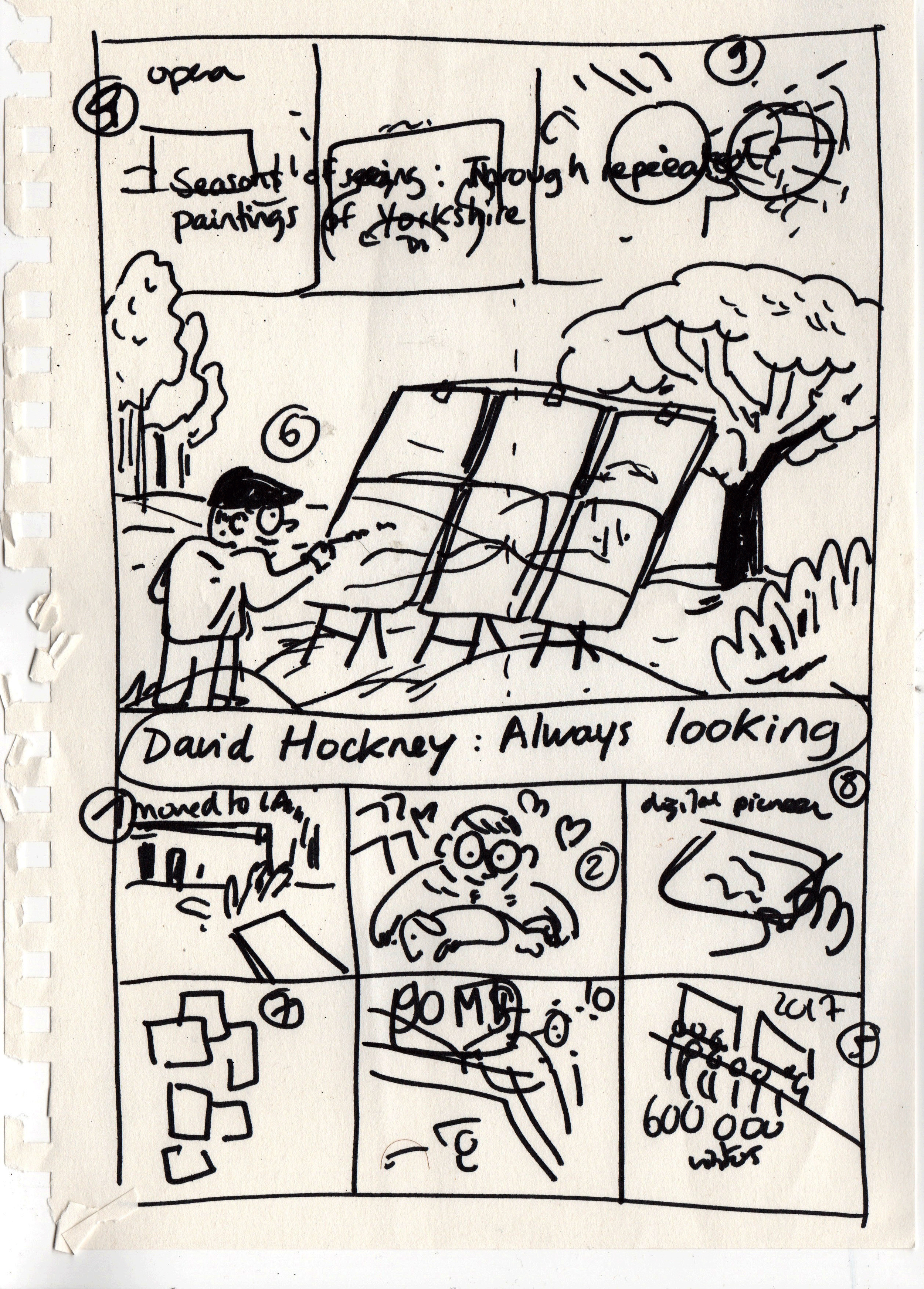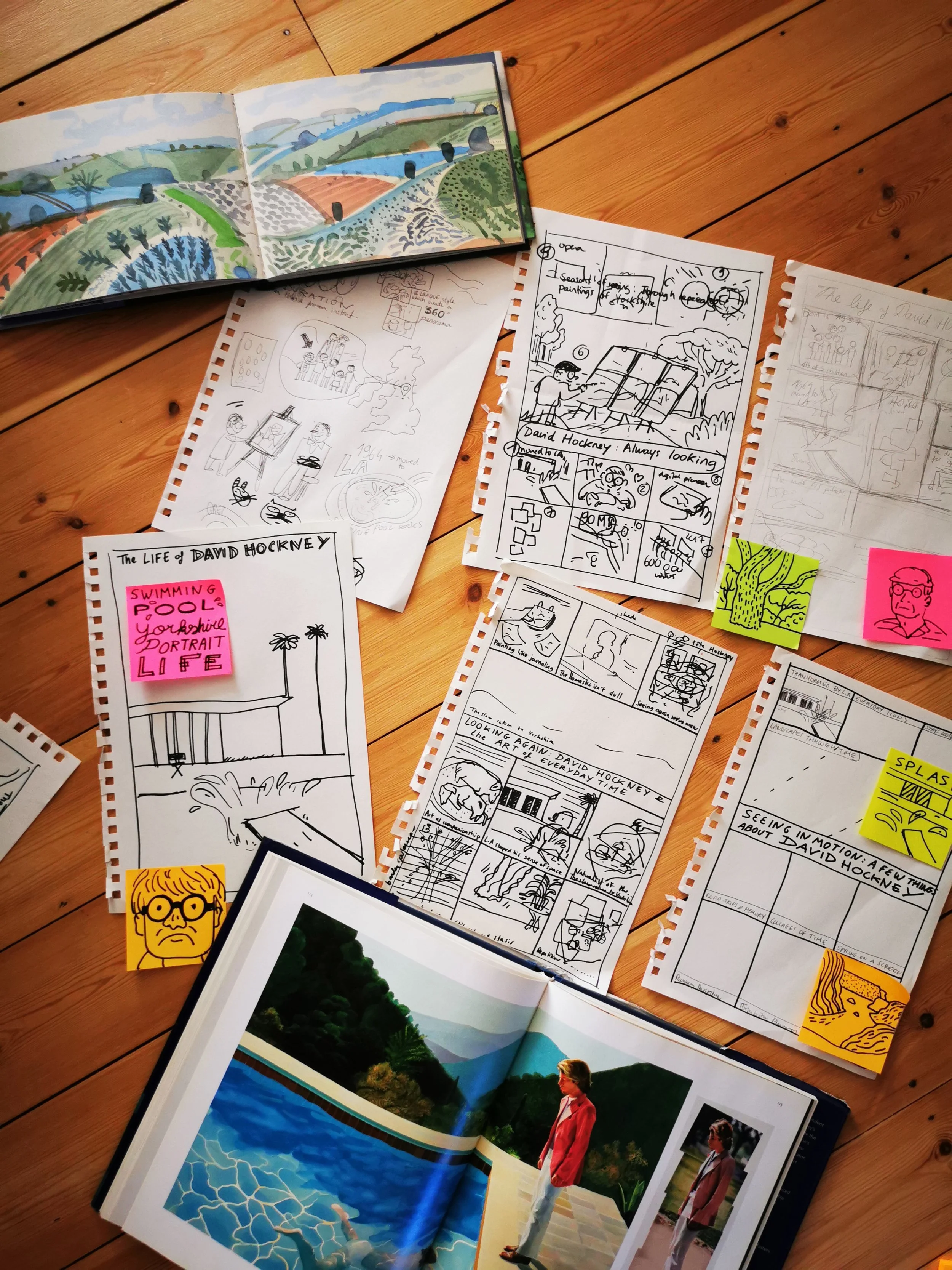 The infographic combines visual analysis and graphic storytelling, translating Hockney’s techniques into a clear, engaging comic that makes the artist’s exploration of daily life memorable.